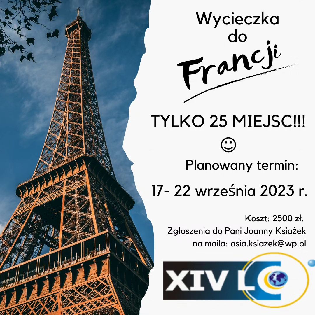 W przyszłym roku szkolnym, zaraz na początku - (wrzesień lub październik) organizowana jest wycieczka szkolna do Francji. Szczegóły znajdziecie poniżej.