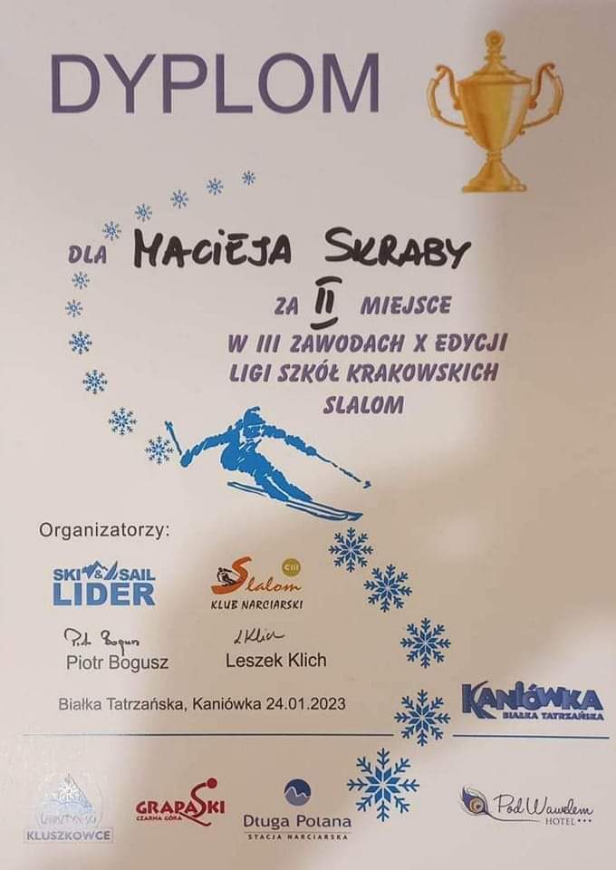 2 miejsce w III zawodach X Edycji Ligi Szkół Krakowskich Slalom w Białce Tatrzańskiej. 🎊🎉
